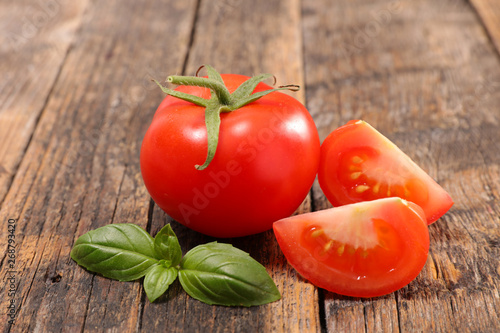 tomato and basil on wood background