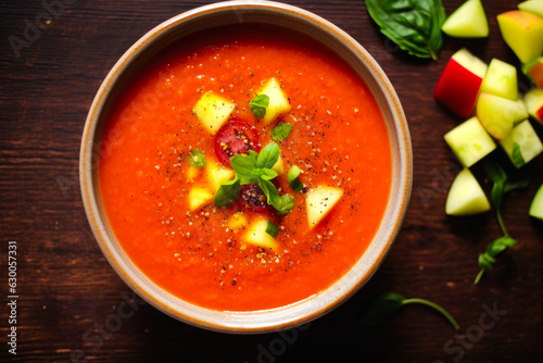 Tomato gazpacho soup with pepper and garlic, Spanish cuisine food. Top down view on a dark bacground