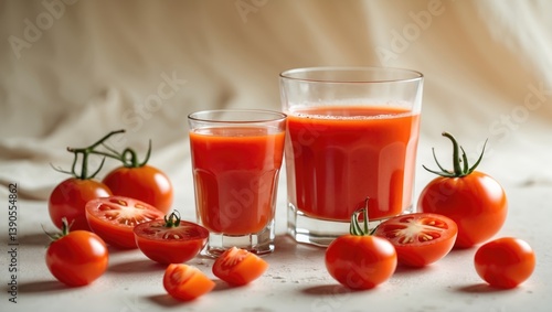 Tomato juice served in a glass alongside fresh tomatoes.
