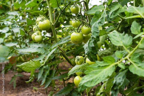 Tomato plants with ripening fruits in the farmer's greenhouse, agriculture and farming concept