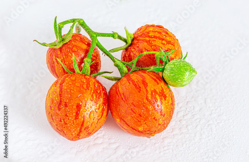 Tomatoes striped tomato close-up on a white plate, cultivar Tigerella.
