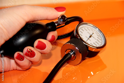Tonometer in a woman's hand with a manicure. A device for measuring pressure.