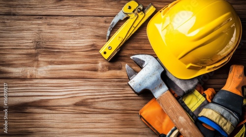 Tools and Safety Gear on Wooden Surface