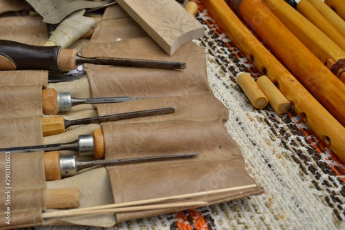 Tools for whistles making placed in leather cover.