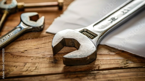 Tools for Work Paper and Fasteners Wrenches on Wood Surface