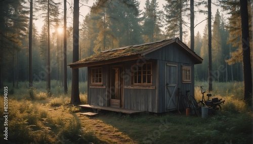 toolshed on a forest at sunset photo from Generative AI