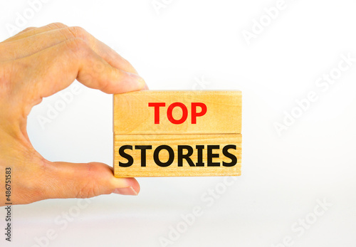 Top stories symbol. Concept words Top stories on wooden blocks on a beautiful white table white background. Businessman hand. Business story and top stories concept, copy space.