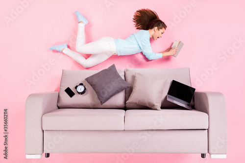 Top view above high angle flat lay flatlay lie concept of her she nice attractive cheery amazed stunned girl lying on divan reading interesting novel having fun isolated pink pastel color background