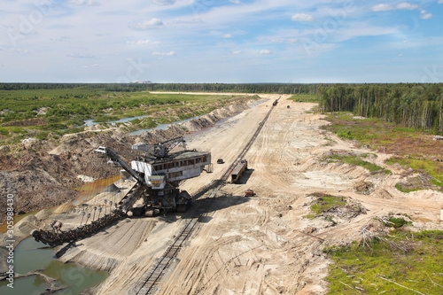 Top view at mine, railway, mining machinery