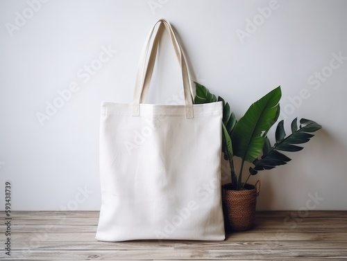 top view blank canvas bag on white wood background, Generative AI