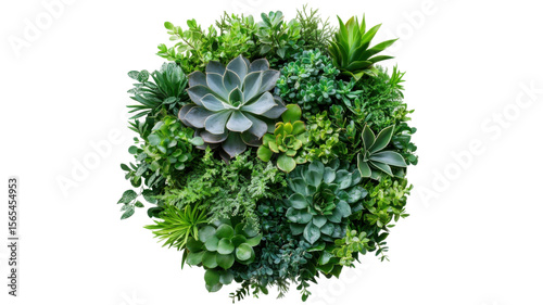Top view circular arrangement of lush green foliage on white background