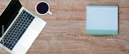 Top view desk with computer laptop and calendar office equipment for work area copy space and work from home or education school background concepts.