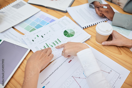 Top view, finance data and hands of business people working on charts, graphs and statistics. Strategy, planning and teamwork of group in collaboration for office research, analytics and analysis.