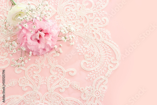 Top view image of delicate flower over pastel background