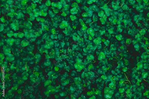 Top view leaf background.Green leaves color tone dark in the morning.Tropical Plant in Thailand,environment,good air.photo concept nature and plant.