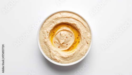 Top view of a bowl filled with homemade chickpea dip on a white surface