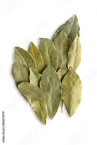 Top view of bunch of dried bay leaves isolated on white background for culinary use for aromatic herbal seasoning in soups, stews, meat, seafood, and vegetable for their flavour and fragrance