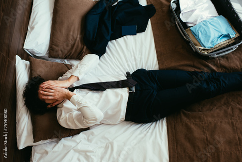 top view of exhausted businessman resting on bed with travel bag in hotel room