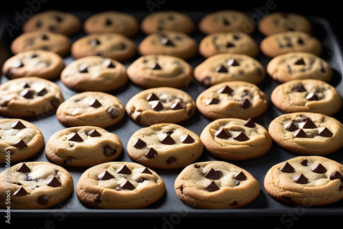 Top view of freshly baked chocolate chip cookies on a baking tray.