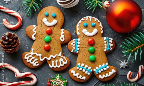 Top View of Gingerbread Men Cookies and a Christmas Ball on a Dark Background