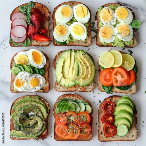 Top view of healthy breakfast toast with avocado, eggs, tomato, arugula, strawberry, fruits and vegetables.