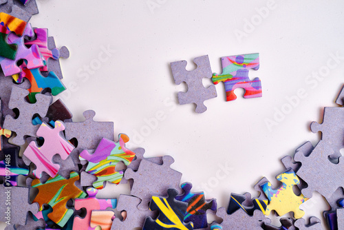 Top view of many puzzle pieces throughout the frame. Background image of scattered colorful puzzle pieces. Mind games