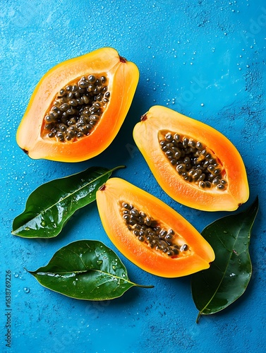 Top view of papaya halves and green leaves on a blue textured background with water droplets