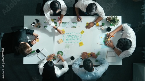 Top view of professional business team working together to brainstorm environmental idea by using mind map. Aerial view of smart manager talking and discussing about sustainable energy. Alimentation.