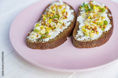 Top view of rye bread sandwiches with cream cheese and sprouted mung beans, walnut, sunflower and flax. raw food diet.