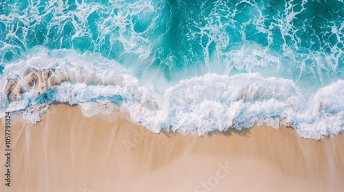 Top view of serene beach waves gently lapping against the shore with ample copy space