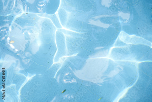 Top view of surface blue swimming pool, reflection on blue water, swirl pattern texture. Leaves in dirty water, opened swimming pool. Background, backdrop with copy space.