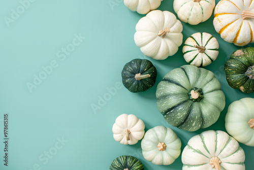 Top view of white and green pumpkins on mint green background with copy space