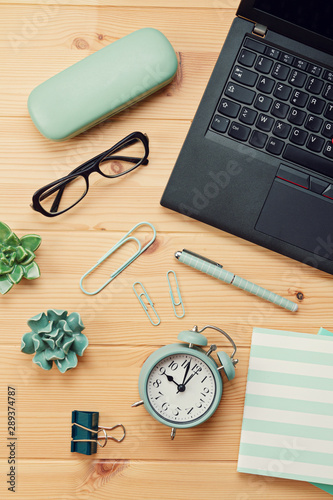 Top view over working place with laptop and office supplies