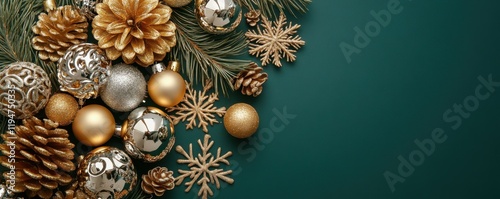 Top view photo of gold and silver christmas tree balls toys cones snowflakes and serpentine on pine branches on isolated green background with copyspace