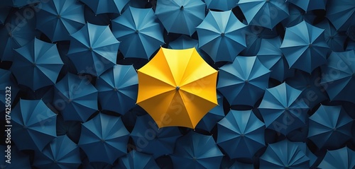 Top view photo of many blue umbrellas and one yellow. Vivid color contrast presents idea of uniqueness. Yellow umbrella stands out against other blue ones.