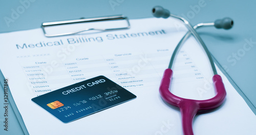 top view picture of medical billing statement, cradit card, and pink stethoscope on the gray background
