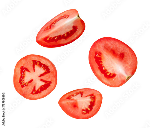 Top view set of ripe red tomato slices in halves and quarters isolated with clipping path in png file format