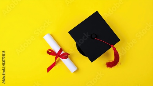 Top-down perspective of mortarboard and diploma isolated on a backdrop, education theme.