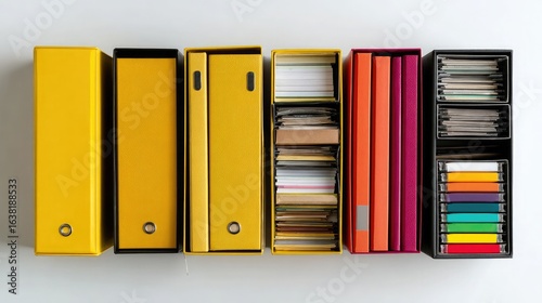 Top-down view of stationary organizer boxes sorted neatly on bright white background