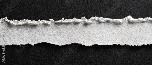 Torn strip of white paper with rough edge on black background highlighting texture and detail