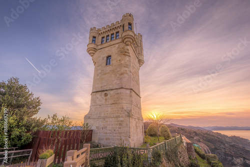 Torreon del Monte Igueldo Tower at Sunset, Historic Stone Lighthouse Tower in San Sebastian, Donostia, Spain