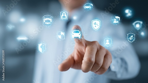 Torso shot of an office worker pointing forward, transparent holographic car insurance icons and shield symbols hovering in front