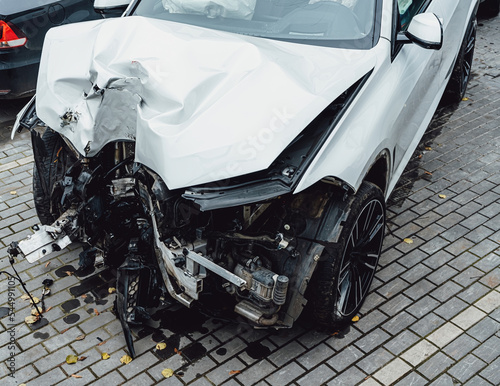Total accident of a white car after hitting a lamppost. Frontal collision. Deployed airbags during rescues.