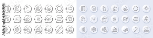 Touch screen, Stress grows and Sale bags line icons. White pin 3d buttons, chat bubbles icons. Pack of Metro, Open door, Search people icon. Gluten free, Credit card, Deckchair pictogram. Vector