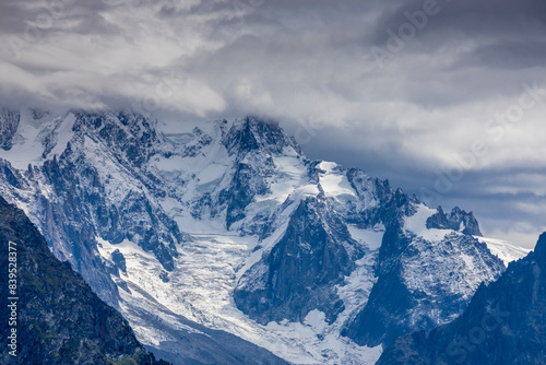 Tour du Montblanc beautiful mountain ladscapes of the Alps green valley, snow summit of Montblanc and rocky peaks of Aiguille du Midi in summer sunny weather blue sky, trekking and hiking in Chamonix
