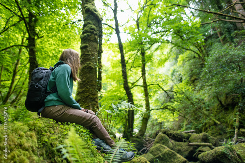 Tourist admiring small waterfalls near Torc Waterfall, located in woodland of Killarney National Park. Ring of Kerry tourist route, Ireland.