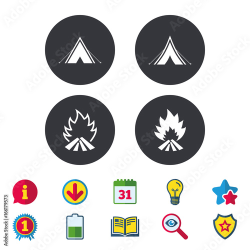 Tourist camping tent icons. Fire flame sign symbols. Calendar, Information and Download signs. Stars, Award and Book icons. Light bulb, Shield and Search. Vector