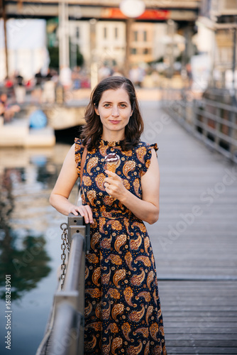 Tourist enjoying ice cream on a bridge in genoa, italy