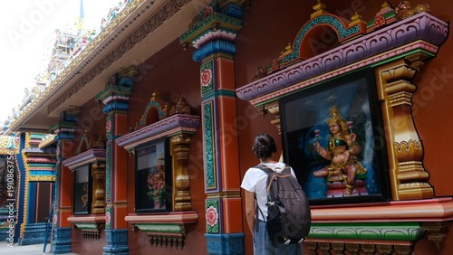 Tourist exploring the vibrant architecture and colorful hindu deity statues at a temple in singapore, reflecting cultural travel and religious traditions