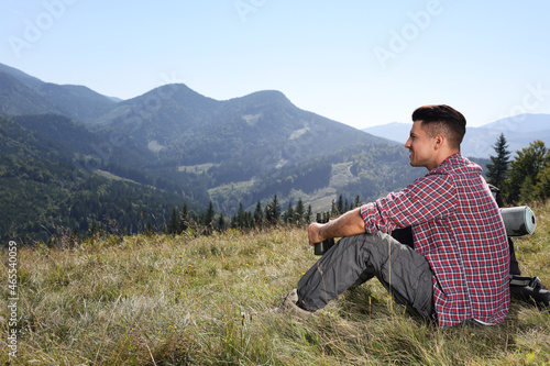 Tourist with backpack sitting on ground and enjoying view in mountains